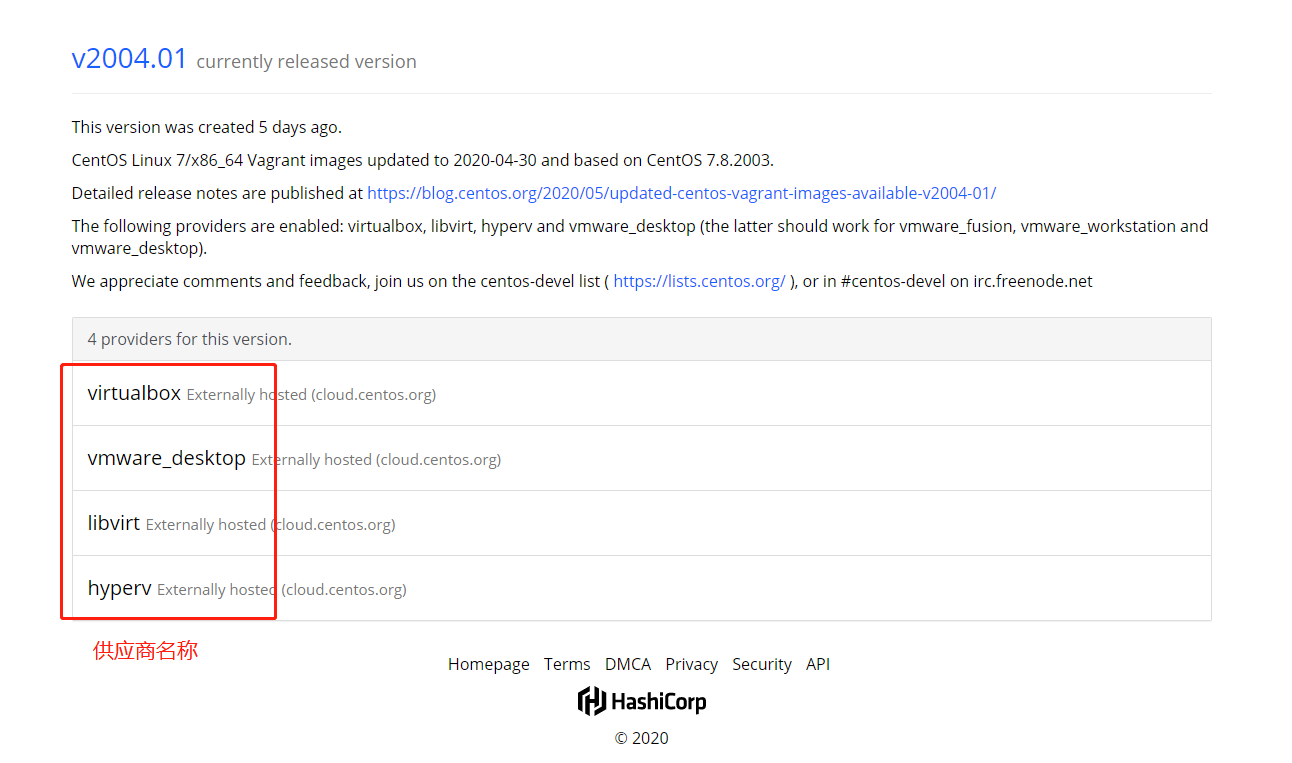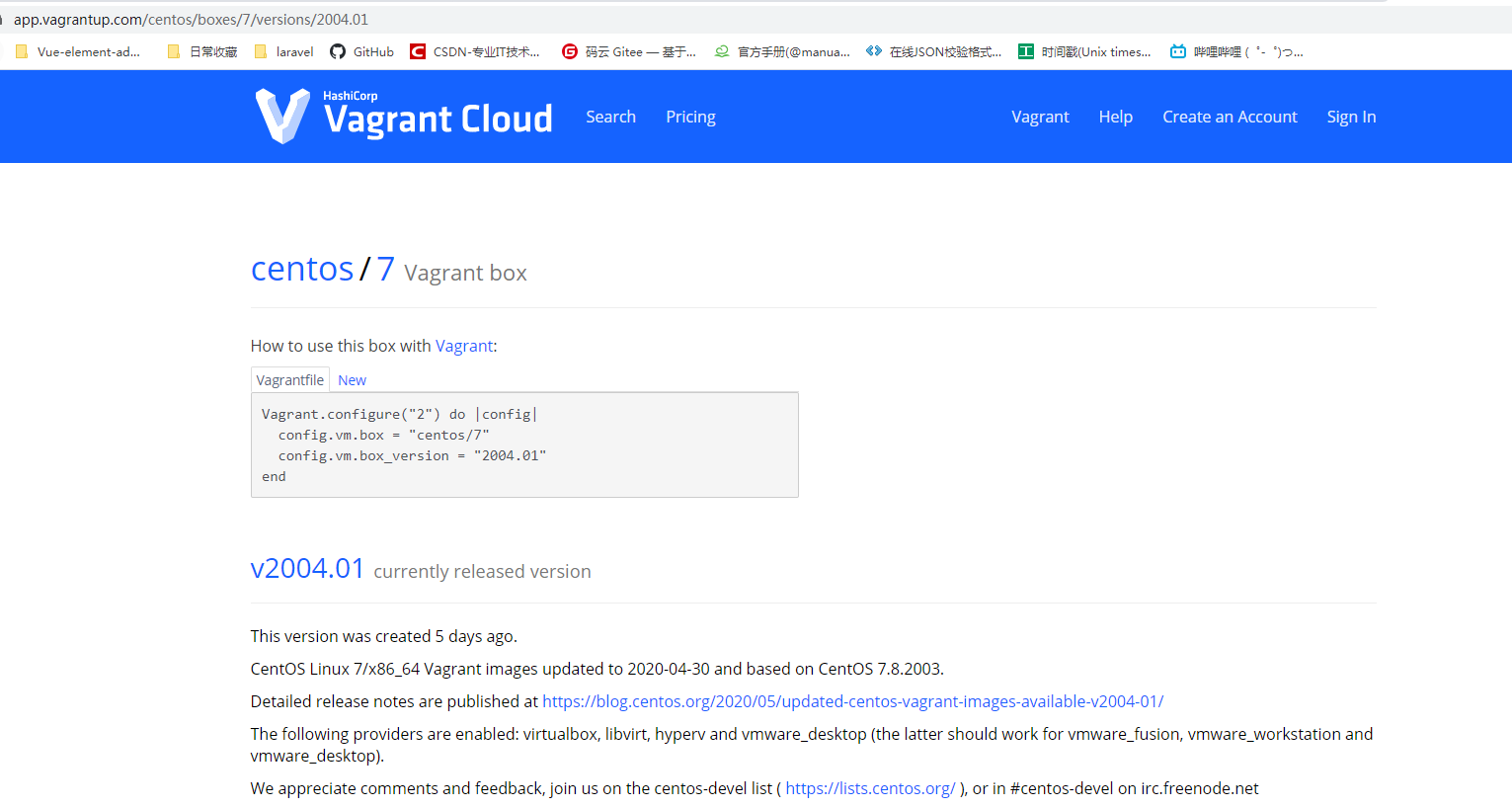 4、 这时候网站地址栏会拼接上相应版本号,这时,不多说,开始拼接URLhttps://app.vagrantup.com/centos/boxes/7/versions/2004.01/providers/供应商名字.box