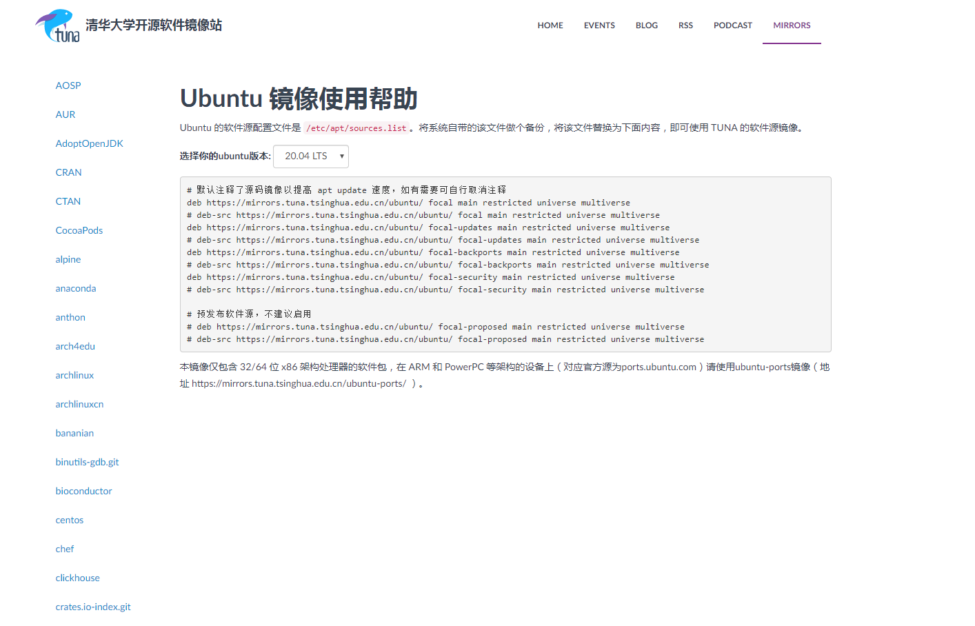 左边栏相应地选择 ubuntu ,这里我们可以看到清华大学已经更新了Ubuntu 软件源到 20.04 版本